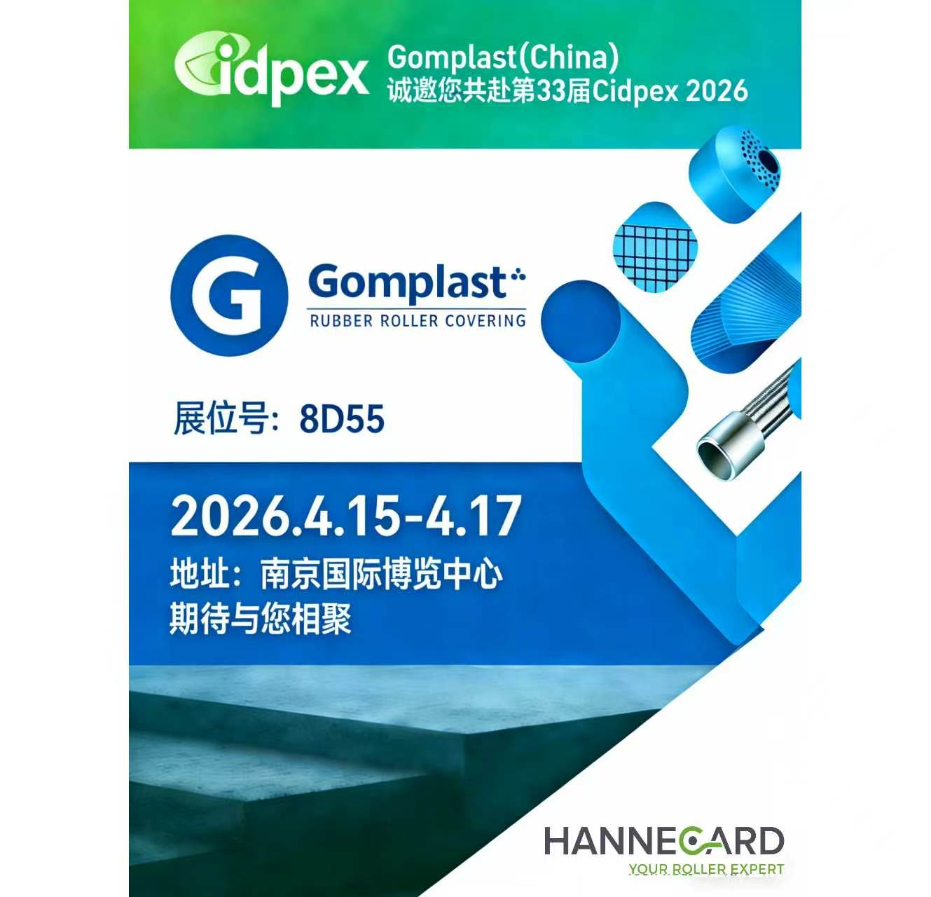 Date: April 15–17, 2026 (Wednesday to Friday) Venue: Nanjing International Expo Center (No. 30 Jiangdong Middle Road, Jianye District) Booth No.: 8D55 As a grand annual event for the industry, the 33rd China International Disposable Paper & Nonwovens Expo & Forum (CIDPEX 2026) will bring together more than 900 exhibitors and 40,000 professional visitors from all over the world, attracting professional buyers from 129 countries and regions. The exhibition covers the entire industrial chain technologies and products of tissue paper and hygiene products. Founded in 2008, Gomplast (China) has been deeply engaged in the field of industrial rubber rollers. Relying on a global R&D and production network, we provide high-quality rubber roller solutions and technical services for tissue paper equipment and production processes, using materials such as rubber and polyurethane. At this exhibition, we will focus on improving production efficiency and equipment durability for the industry, showcasing core rubber roller products and technical maintenance solutions suitable for tissue paper production lines, helping customers optimize production processes and reduce operation and maintenance costs. We sincerely invite industry partners to visit our booth to discuss development opportunities and seek win-win cooperation! For inquiries, please contact us via email at gomplast@gomplast.com.cn or call us at 0519-85772590 to receive exclusive exhibition services. Gomplast (China) – Empowering the efficient upgrading of the tissue paper industry with professional rubber roller technology!